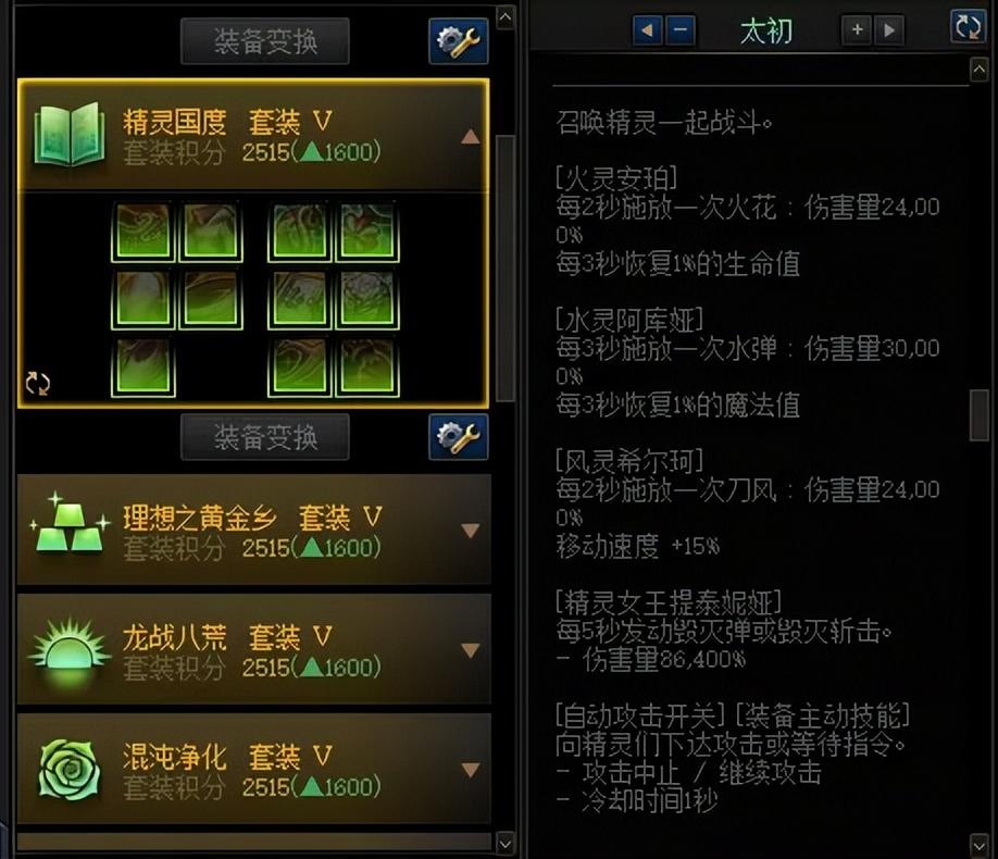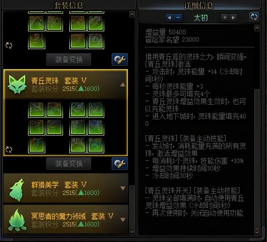 總的來說呢,追求傷害可選擇“黃金鄉”“龍戰八荒”和“青丘靈珠”,覺醒流可用“究極能量”,其他套裝就需要根據自己需求來選擇了。