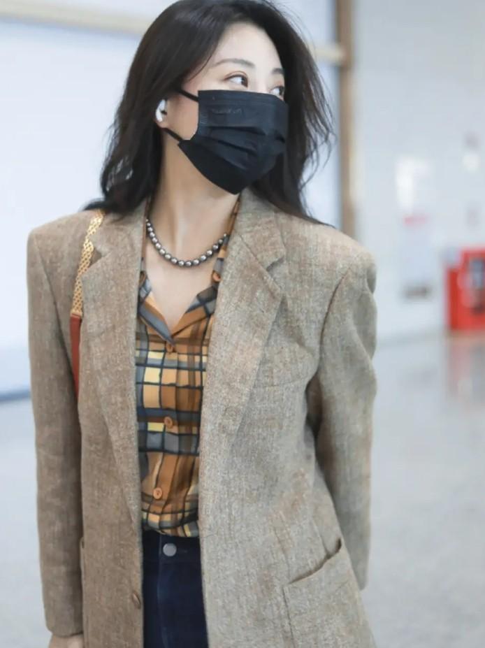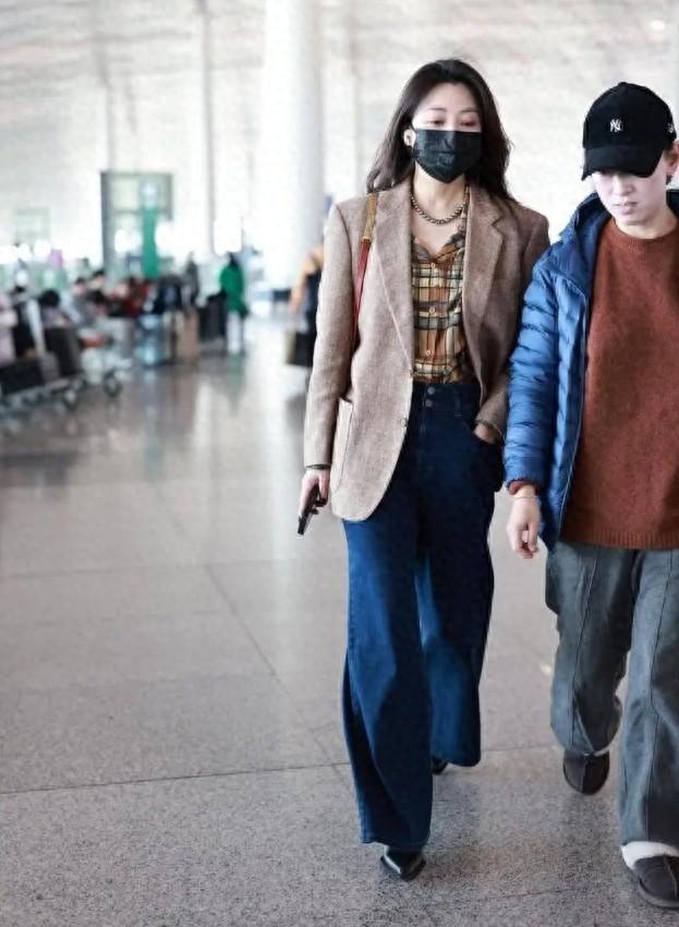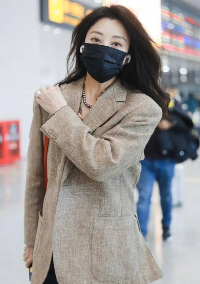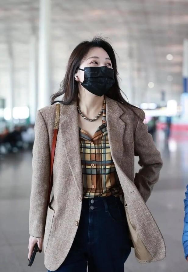 殷桃真不把自己當明星,披頭散髮走機場,穿80年代西裝意外時尚