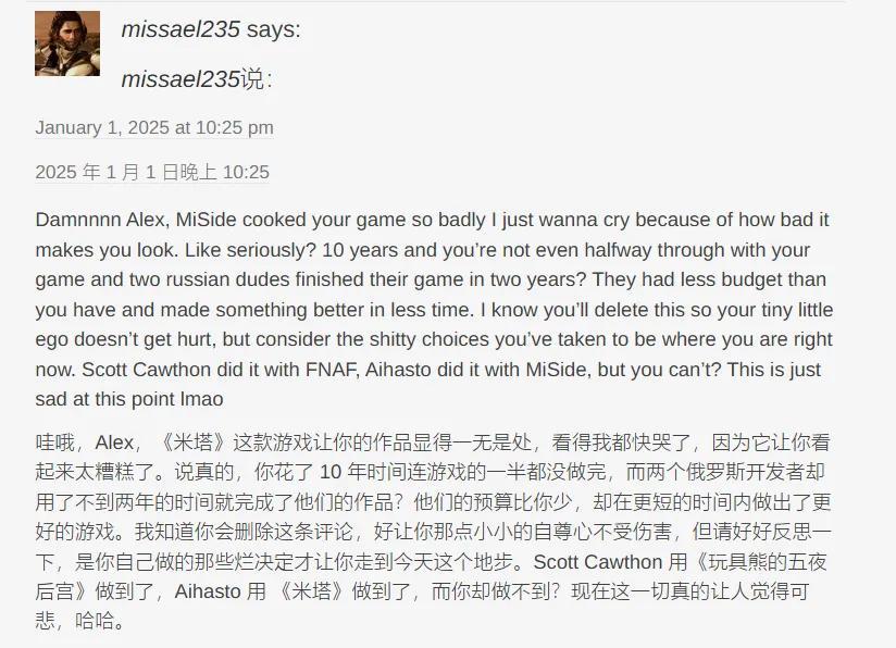 《米塔》發售後,也有一些玩家拿着這款遊戲的成績單跑來質問Alex:“看看人家做得又快又好,你真的不會感到羞愧嗎?”