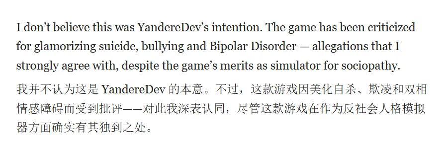 長期浸淫於4chan論壇的Alex壓根沒想過自己的遊戲原來還能跟“美化自殺”扯上關係,他認爲自己只是把二次元作品中常見的病嬌角色做成了遊戲而已。當然,主流輿論對於《病嬌模擬器》的批判,很大程度上也受到了那個年代抵制校園暴力題材的社會思潮所帶來的影響。