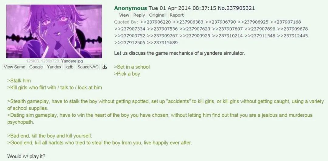 以互聯網留存至今的信息來看,《病嬌模擬器》的作者Alex Mahan(下文簡稱Alex),於4月1日當天在4chan論壇的遊戲板塊裏構建了遊戲的雛形。他將自己心中那款模擬病嬌的遊戲,以文字的形式描繪了出來:潛行尾隨玩法、約會戀愛模擬、遊戲還分爲兩個結局,分別是自殺BE和獨佔HE……