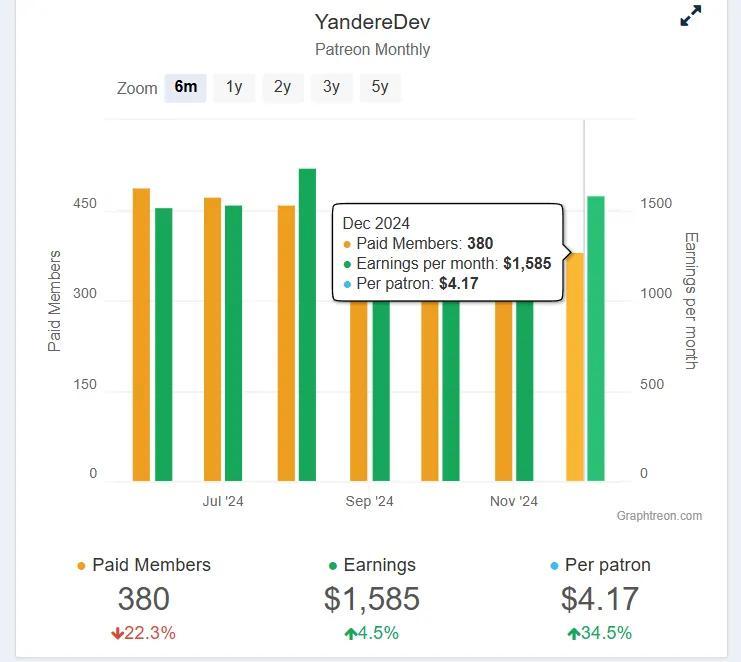 在付費訂閱平臺Patreon上,Alex靠着《病嬌模擬器》作者的身份,每個月都能收穫忠實粉絲的訂閱贊助。哪怕是人氣連年下跌,在2023年爆出“與未成年人調情”的醜聞之後,整個2024年Alex仍能通過Patreon獲得1500美元/月。要是再算上過往10年裏他的油管視頻變現能力以及Twitch直播的禮物收入,Alex在《病嬌模擬器》從未正式發售的情況下,也已經賺到了一大筆錢。