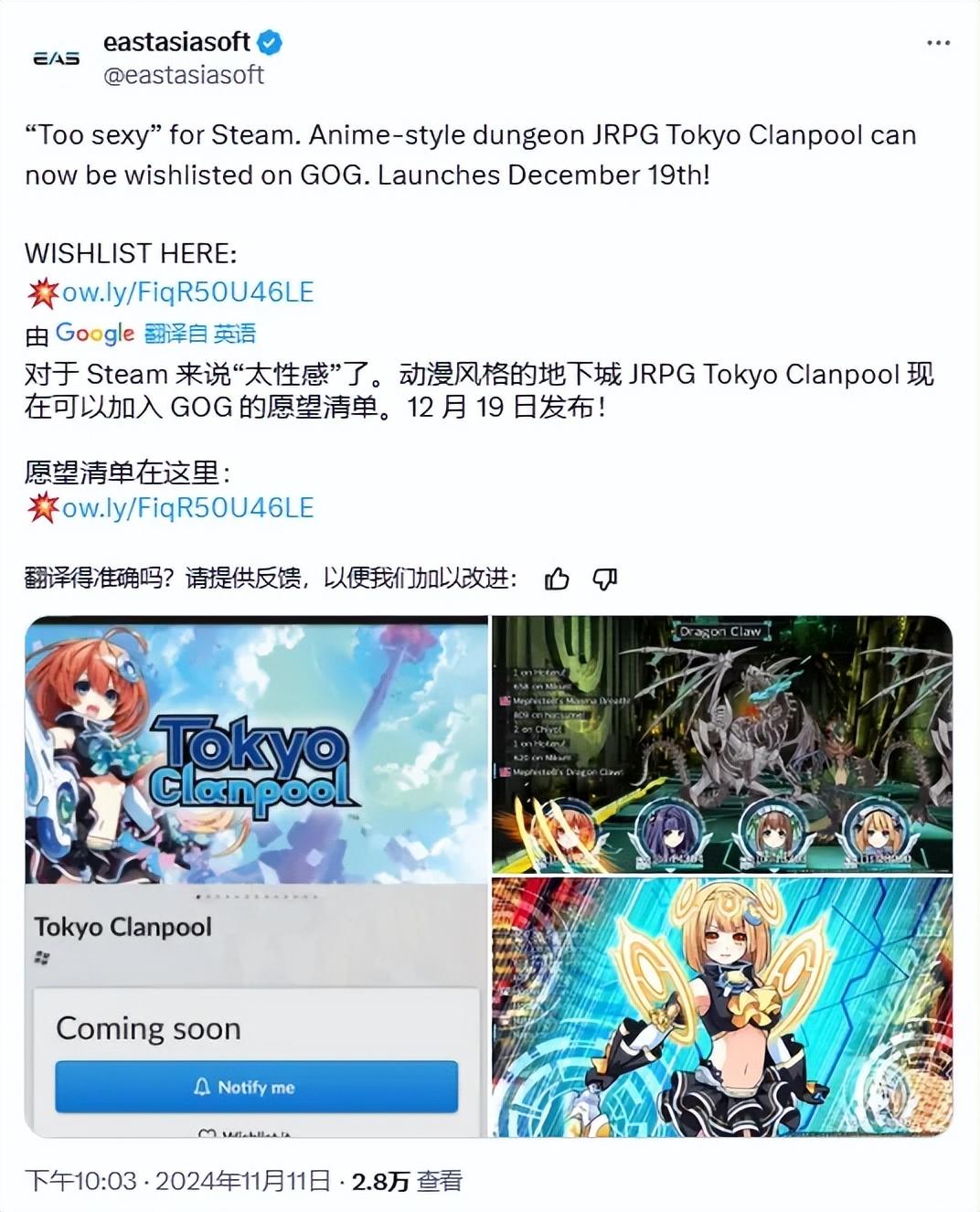 《碧藍航線》並不是因此遭到審查的唯一案例,去年11月,JRPG遊戲《塔京Clanpool》英文版宣佈登陸Steam,也遭到了Steam 拒絕,理由是這些動漫風格的角色着裝“過於性感”,最終遊戲不得不放棄Steam,轉而在GOG上發佈。