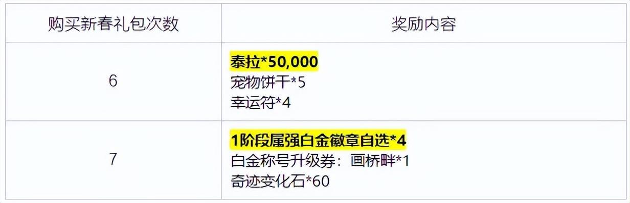 購買第7套禮包,在原有稱號升級券、60個奇蹟變換石基礎上,新增4個1階屬強徽章!