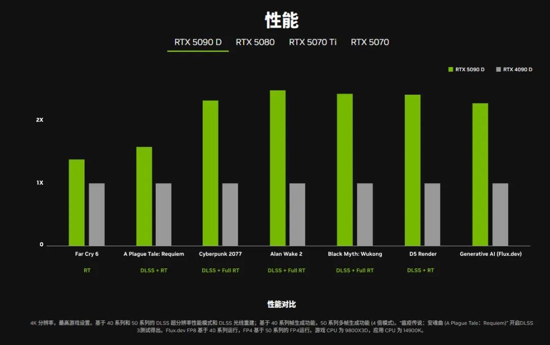 這個對比圖細看之下還是有挺多門道的。NVIDIA比較厚道地列出了列出了幾種不同的測試場景,而不是完全選用最有利於新顯卡的遊戲項目。右側新舊提升最大的幾款遊戲應用,主要得益於50系顯卡獨佔的DLSS4發揮了巨大作用。左側提升最小的《孤島驚魂6》,則不支持DLSS;提升稍小的《瘟疫傳說:安魂曲》,則支持到DLSS 3。
