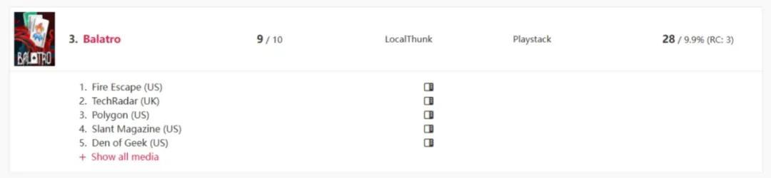 根據信息追蹤網站GOTY Award Tracker統計的數據,截至2025年初,由Localthunk獨立開發的《小丑牌》在全球各地的媒體評選活動中總計斬獲了28個年度遊戲獎項,成爲去年獲得該獎項數量第三多的作品,僅次於《宇宙機器人》與《最終幻想7:重生》。
