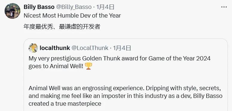 1月4日的時候,Localthunk專門搞了個Golden Thunk獎,沒有媒體投票,也沒有玩家評選,全憑Localthunk個人的口味和愛好,挑選6款來自2024年的優秀遊戲。其中,《動物井》毫無懸念榮獲Golden Thunk年度遊戲,Localthunk表示:“《動物井》是一次引人入勝的遊戲體驗。它充滿了風格和祕密,讓我作爲一名遊戲開發者感到自己像個冒牌貨(也有指‘冒名頂替綜合徵’之意),Billy Basso 打造了一部真正的傑作。”