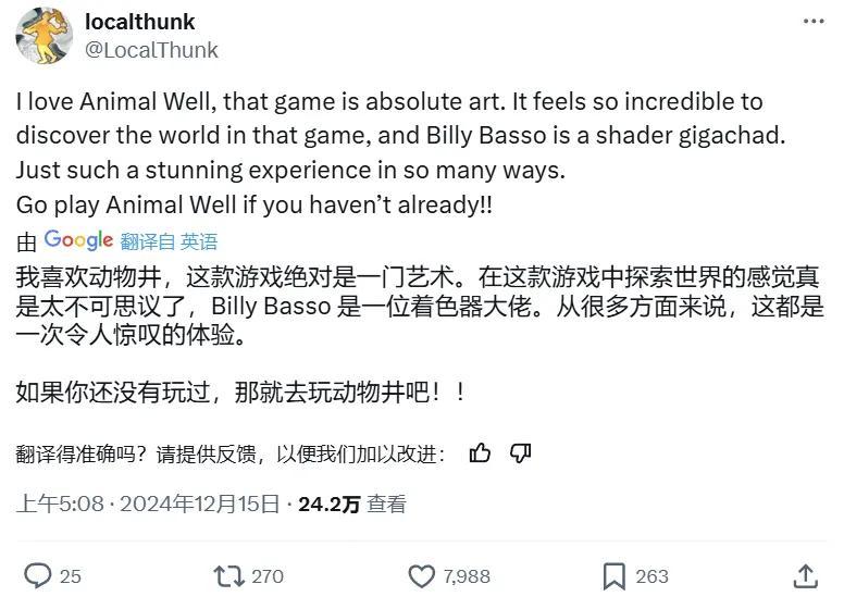 其實《小丑牌》的開發者Localthunk也是這麼想的。早在2024年TGA年度獨立遊戲提名公佈之時,他就已經提前爲《動物井》送上了祝福:“《動物井》是一款極其美妙的遊戲,完全值得年度遊戲的獎項”;當自己的遊戲被評選爲TGA年度獨立遊戲之後,Localthunk也在第一時間向大家安利了《動物井》:
