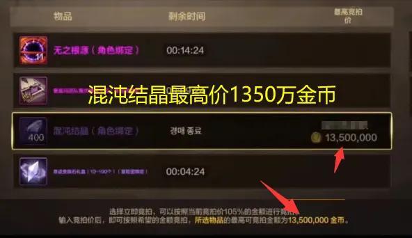 “混沌結晶”可以用金幣競拍,並且最高價只需要1350萬!(這裏體驗服價格)