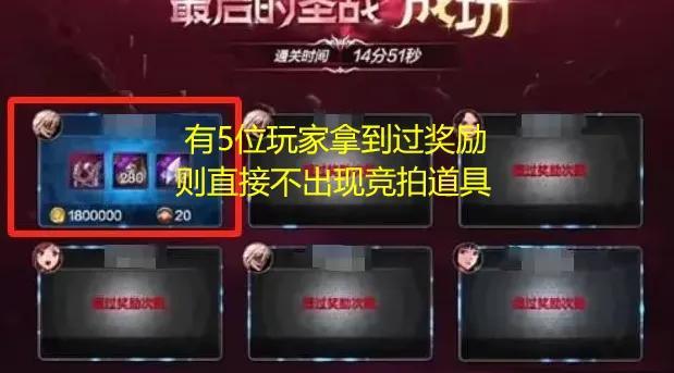 【2】如果一波團中,已經有5位玩家通關拿到過獎勵了,那麼本次通關直接沒有競拍道具了!