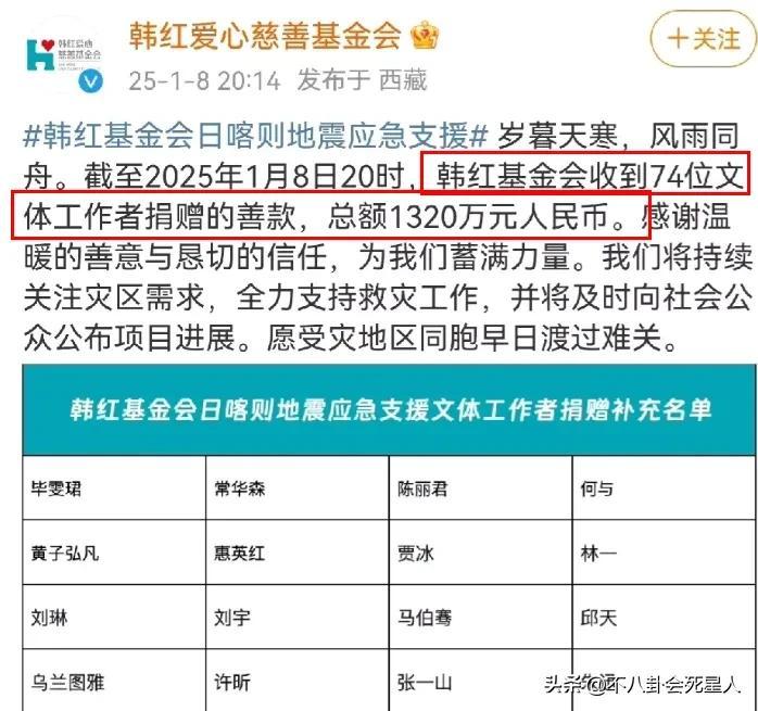 比如這次的西藏地震,圈內明星通過韓紅成立的“韓紅愛心慈善基金”籌集的善款已經超過了1千萬,一共有近80位明星參與捐款。