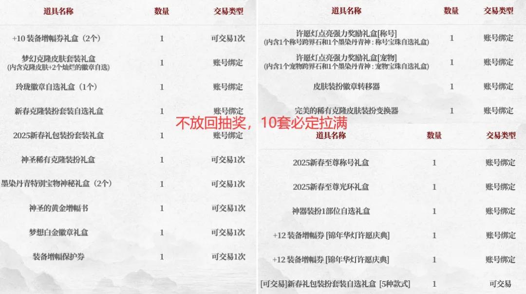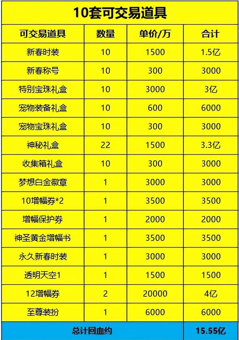 然後總結一下:25年新春禮包含雙至尊雙寶珠,購1套約回血9000萬,購10套可保底雙至尊,總計回血約15.55億,爲近年來最高,但需留意寶珠使用和增幅券價值不確定性。