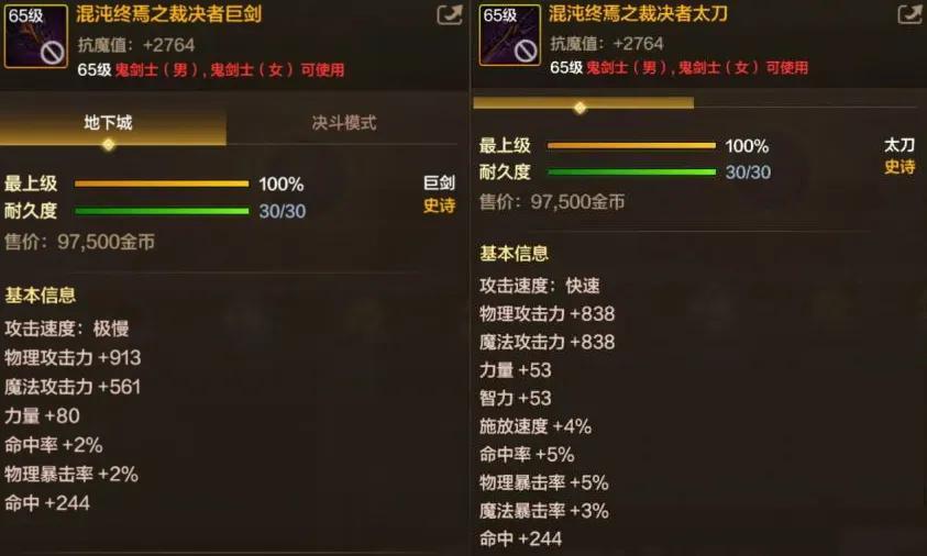 反觀“太刀”就不太給力了,雖然多了3%物暴,但基礎物攻和力量均不如巨劍!