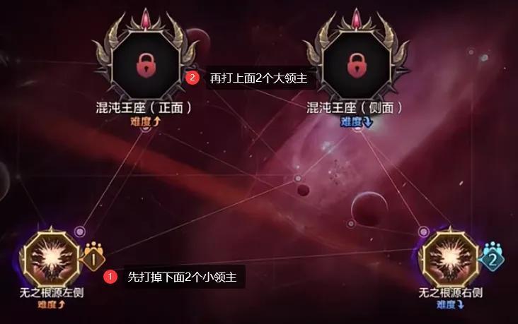 「攻堅目標」先打掉下面2個無之根源小領主,再打掉上方2個混沌王座即算通關!