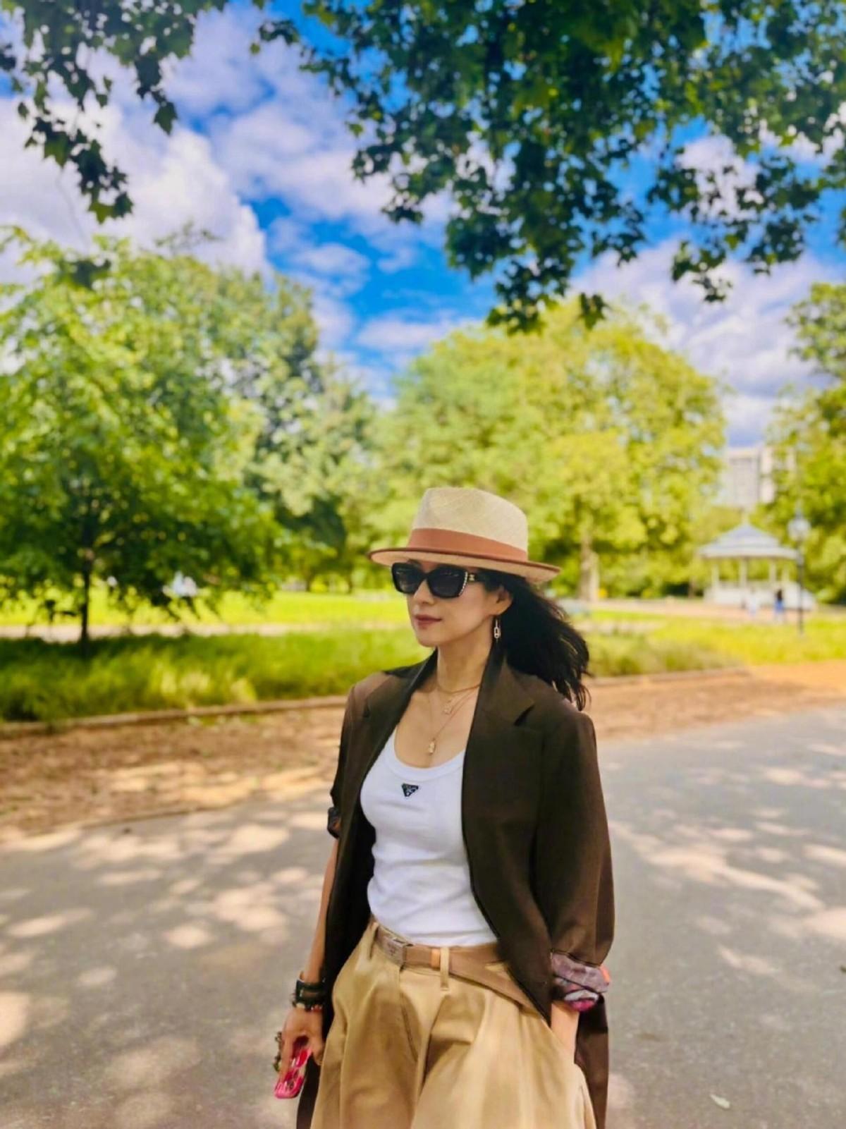 說到配飾,耳環項鍊手鍊這些常規單品外,度假時可以像章子怡一樣戴上一頂編織款禮服帽再搭配墨鏡,氛圍感直接拿捏住。我們可以仔細看她這一身穿搭,雖然用到的單品不少,顏色跨度卻很舒服,基本就是咖棕色和白色。