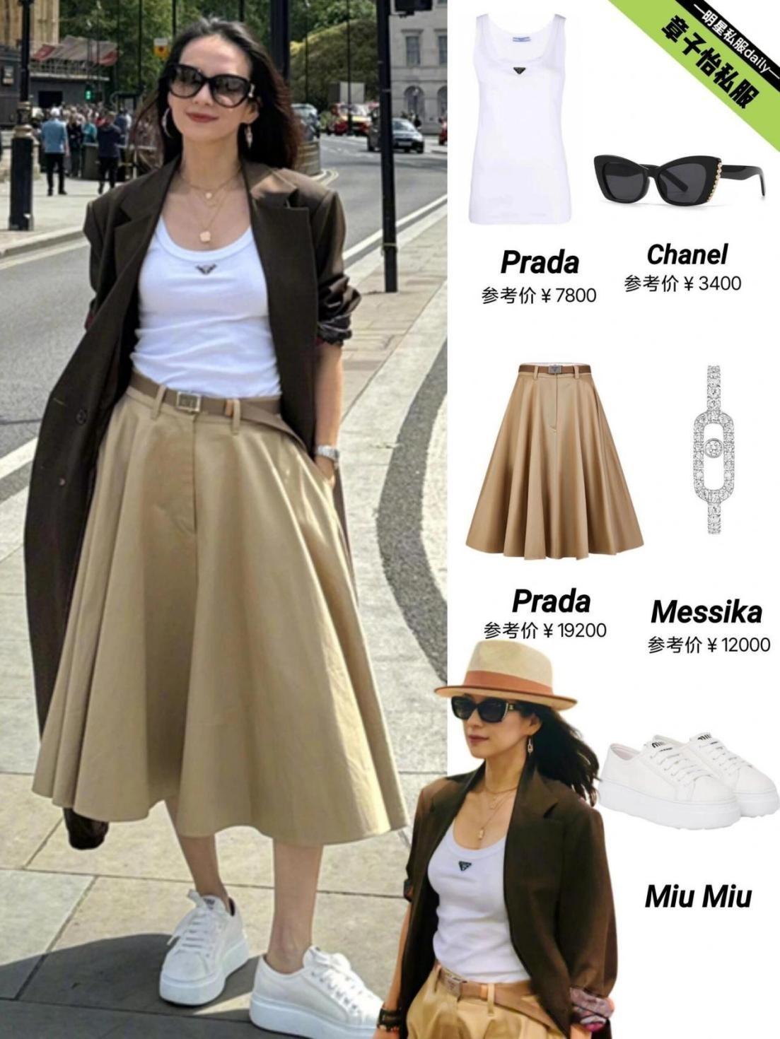 深棕色長款西裝外套,內搭Prada白色低領背心,下半身一條春夏就開始流行的卡其色工裝風傘裙同樣來自Prada,腳上穿了一雙MiuMiu厚底小白鞋。渾身上下都是大牌,個個價值不菲。