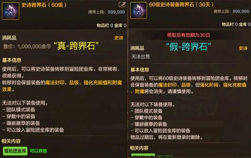 而“假跨界石”跨界裝備時,可以保留魔法封印和品級,但不保留強化和附魔效果,有效期僅爲30天,並且還無法賣給商店!