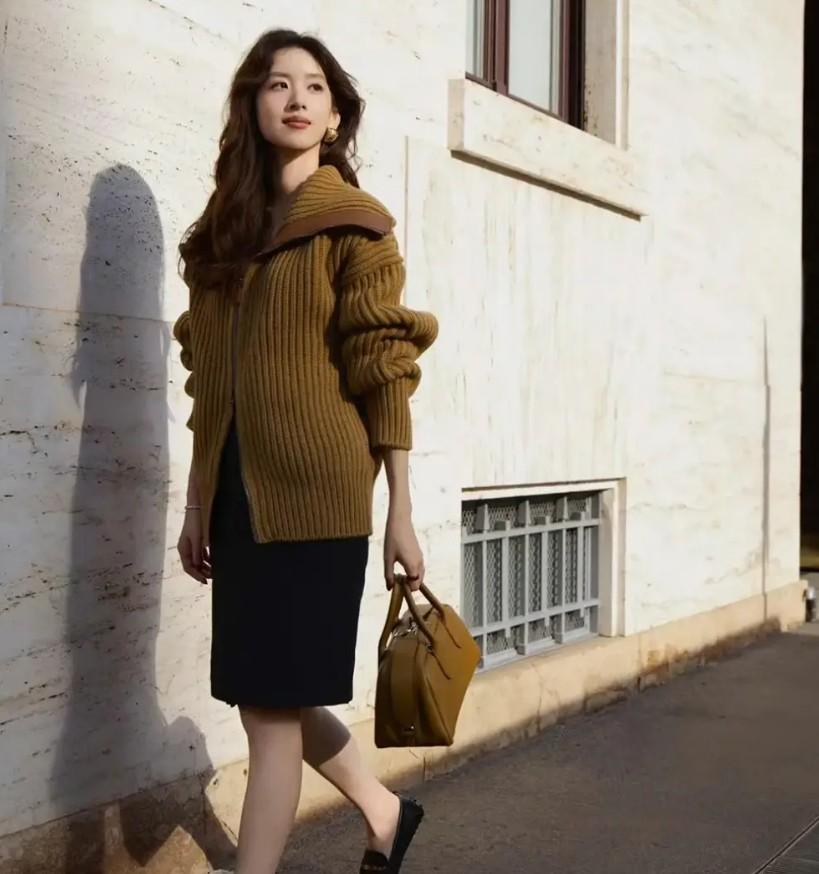 米蘭購物的章澤天大玩“美拉德”穿搭,一萬七的焦糖色羊毛拼皮革拉鍊夾克搭配直筒小黑裙,是舒適感滿滿的逛街標配。焦糖色羊毛夾克襯得她膚白如雪,親切感十足。