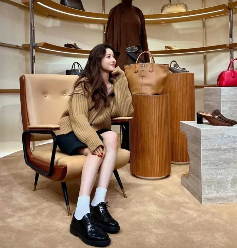 章澤天這組穿搭,通過鞋子的搭配帶給我們兩種截然不同的風格。搭配了一雙黑色細帶皮鞋搭配一雙白色短襪,一整個乖巧又減齡的學院風女大既視感。街拍中選擇了一雙經典復古的黑色豆豆鞋,立馬女大變貴婦,渾身透着優雅知性的成熟女性氣質。