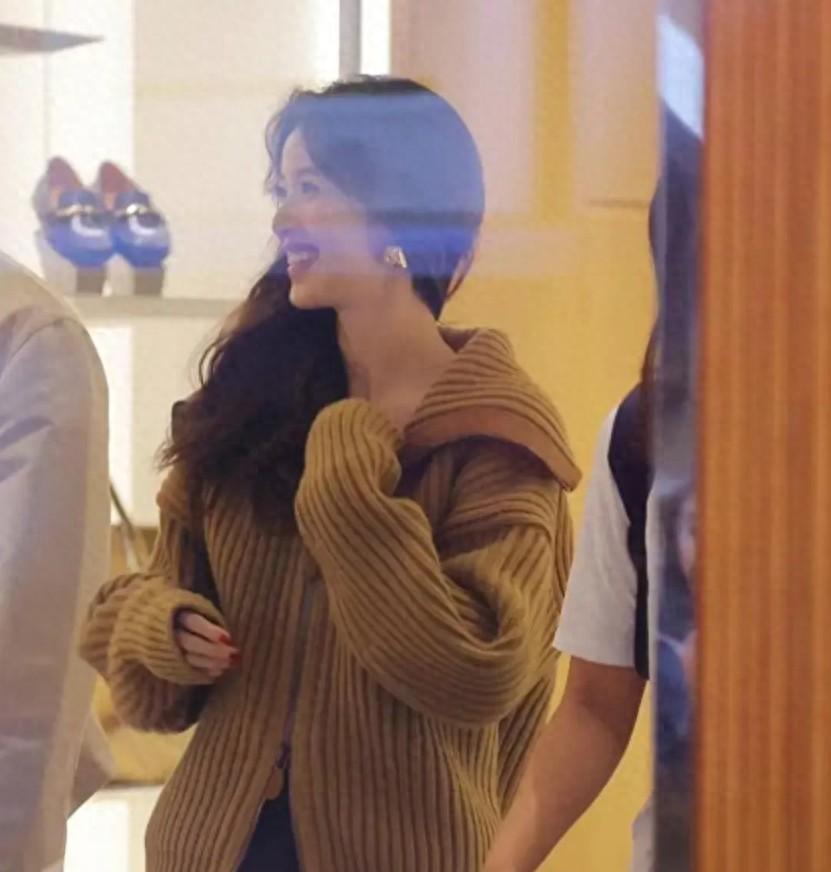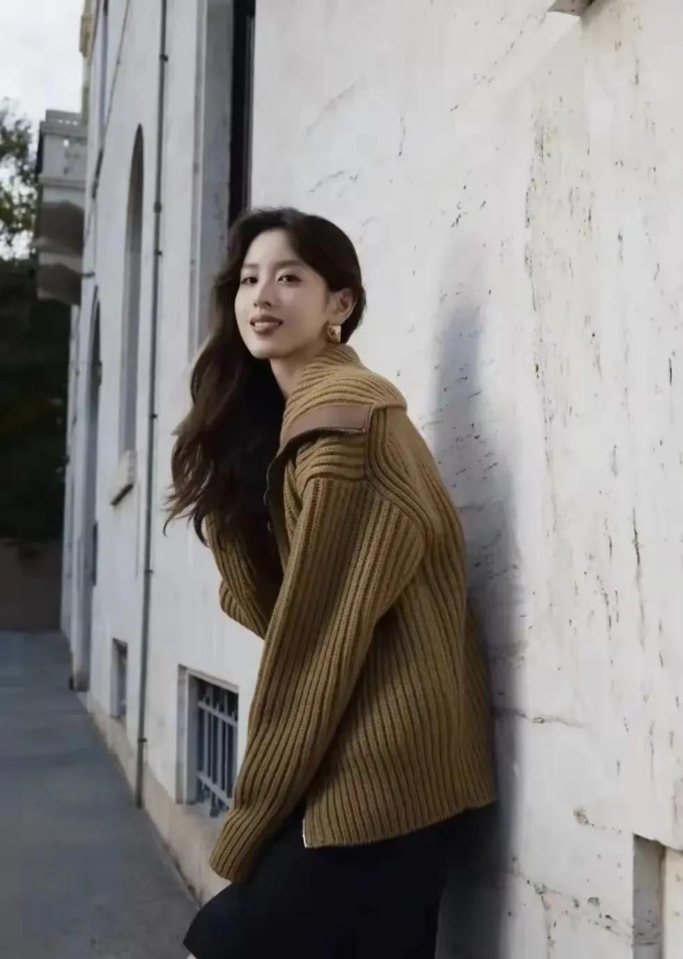 這件焦糖色毛衫夾克的大翻領設計也堪稱一絕,慵懶又帶了點小性感,將她本人細膩潔白的脖頸線條優勢放大,配上她同色系捲髮一整個洋氣時髦精。