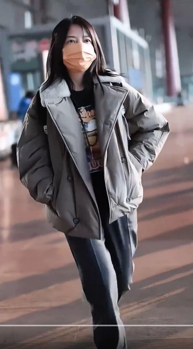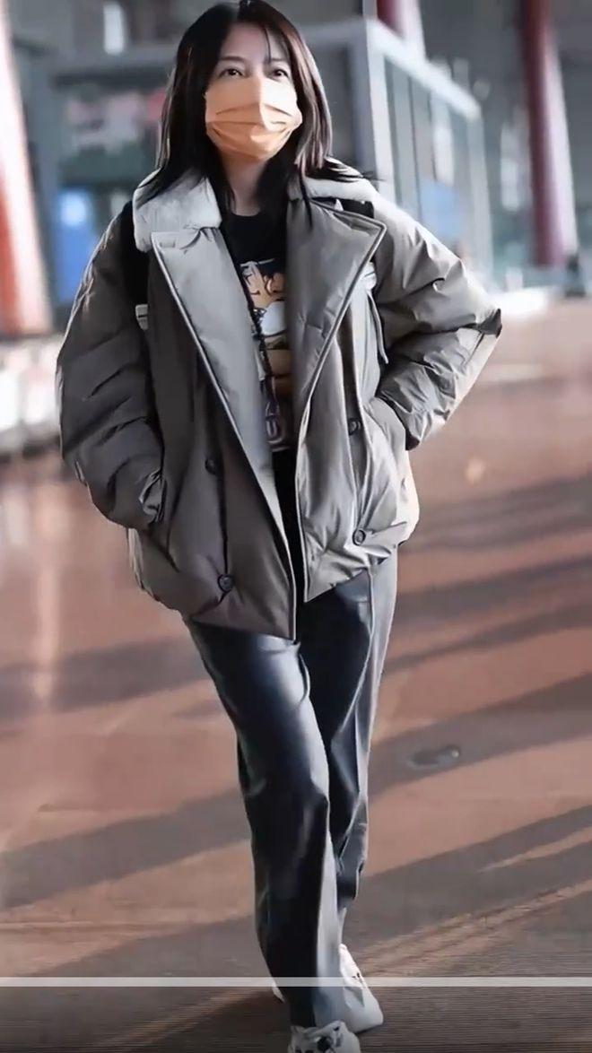 下半身趙薇穿了一條同色系灰色休閒褲,寬鬆直筒的褲型可以修飾腿型,搭配小白鞋鬆弛感滿滿。上半身如果選擇了相對oversize的廓形棉服,下半身建議小仙女們儘量選擇直筒修身的褲裝,比如直筒休閒褲、鯊魚褲或者修身微喇褲等等,上寬下窄纔是顯瘦王道哦!