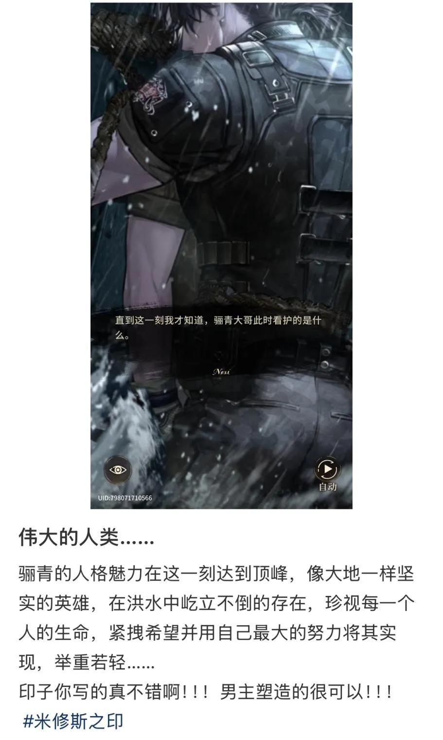 比如在男主角“驪青”的個人線中,洪水席捲城區,水庫開始大量排水,作爲指揮官的驪青拯救完所有幸存者後,爲了保護隊友的屍體不被開閘後的水流沖走,毅然選擇了用身體對抗洪水,這段細膩的角色刻畫,就成了很多玩家喜歡上這個角色的契機。