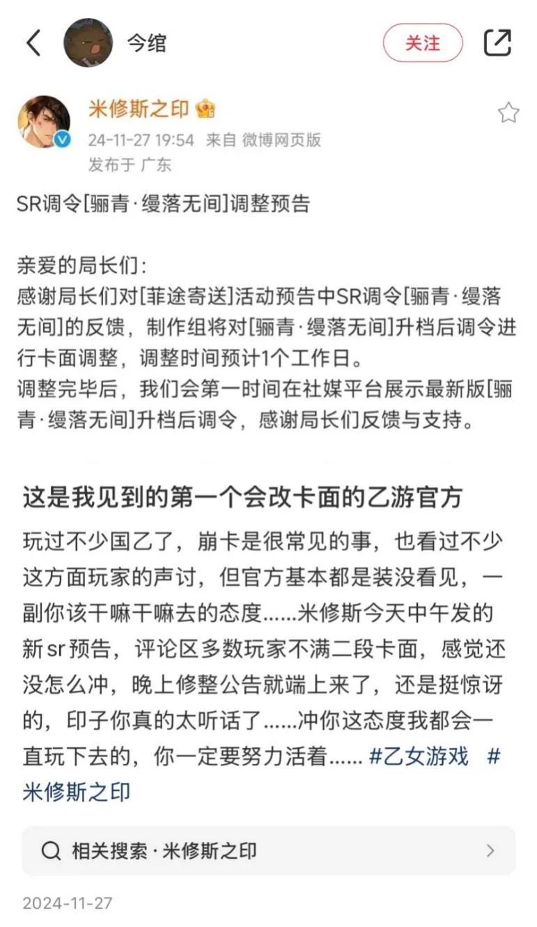 開服後,主控被詬病“小白花”,在劇情中起到的作用不大,遊戲便在後期加入了更多彰顯主控魅力的劇情,讓玩家能夠獲得更多參與感;甚至就連新卡預告,玩家覺得男主角不太好看時,開發團隊也僅僅花了一天,就翻修完了讓玩家不滿的卡面。