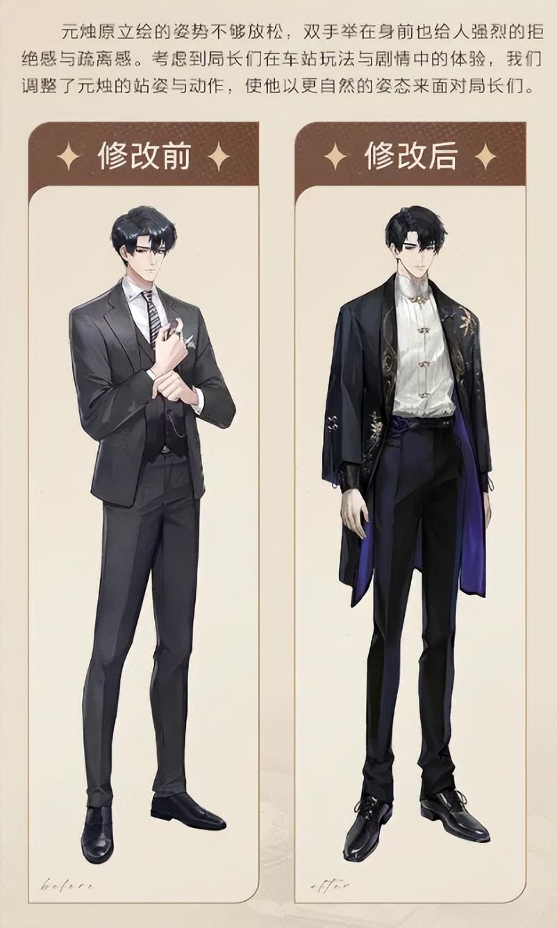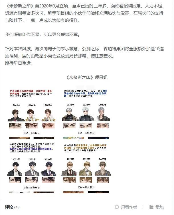 批評歸批評,玩家間期待遊戲上線的呼聲一直很高。首測之後,官方團隊花了一年時間調整立繪,從氣質到服飾再到人物姿勢,對四位男主角的形象大刀闊斧翻修了兩次,期間事無鉅細向玩家彙報各種細節,這纔有了現在的《米修斯之印》。