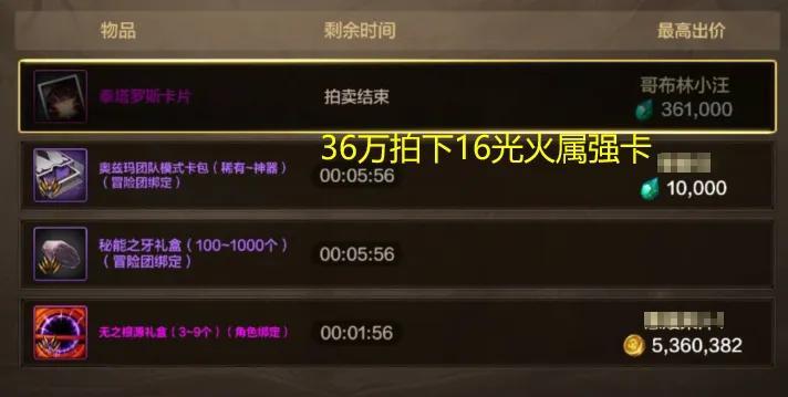 以我自己的一波團爲例,競拍出現了“泰塔羅斯卡片”16光火屬強,直接以36萬泰拉最高價拍下;