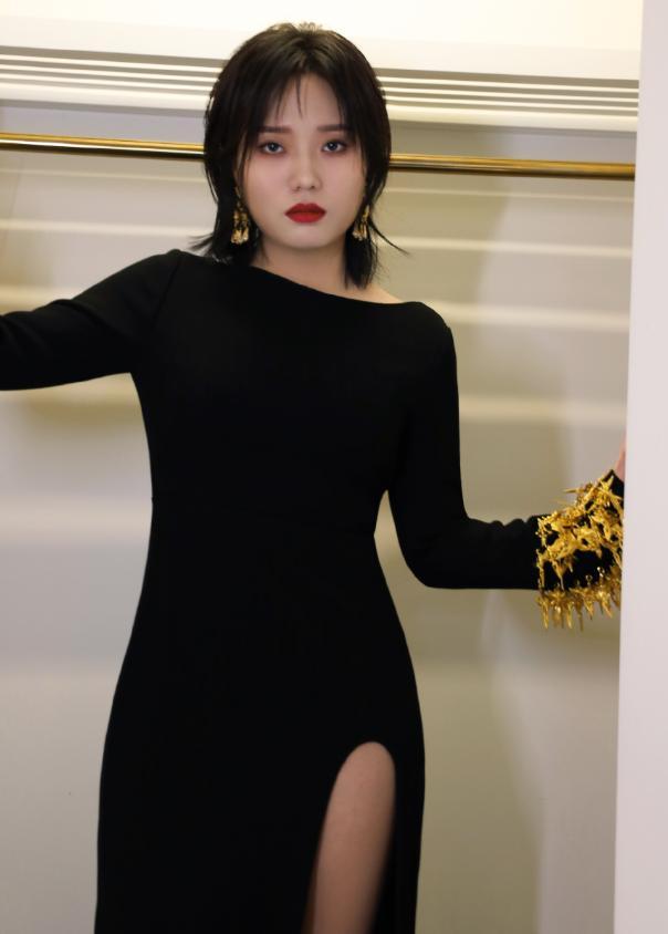 黑色長袖連衣裙,肩部爲露肩設計,露出一側肩膀,增添了一絲性感和優雅。裙子的開叉設計是一大亮點,開叉到大腿位置,在行走間能夠露出腿部線條,增加了動態的美感和時尚感,同時也讓整體造型更加靈動。