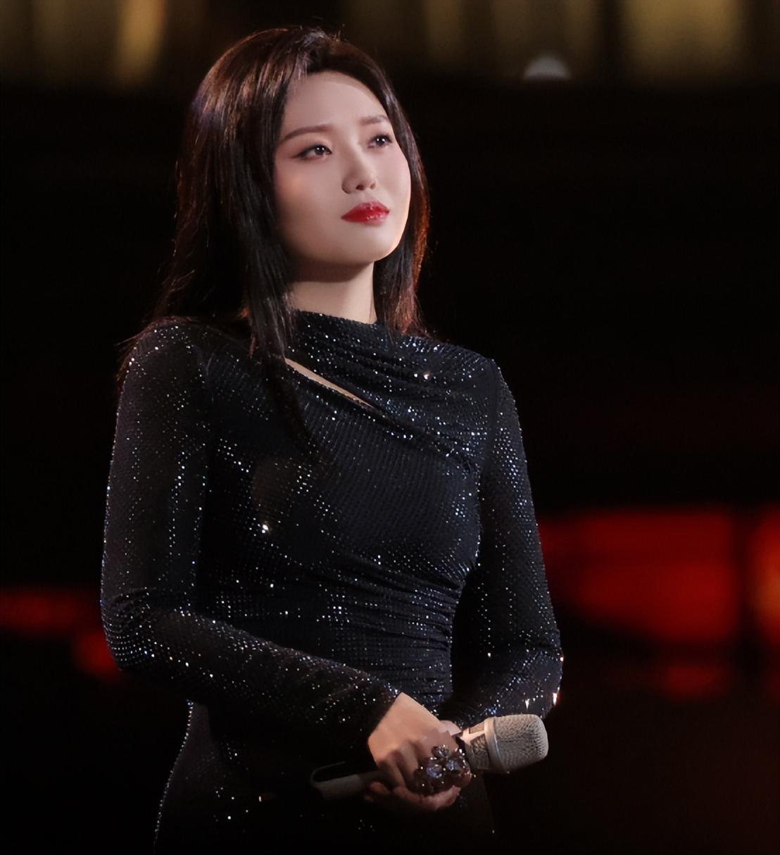 李雪琴穿着一件黑色亮片連衣裙,長袖設計,整體較爲修身,能夠凸顯身材曲線。領口處有獨特的不規則剪裁,增加了設計感和時尚感,使頸部線條更加優美。黑色是經典且百搭的顏色,亮片元素的加入讓黑色不再單調,在光線照射下閃閃發光,增添了華麗感和視覺吸引力,適合在一些正式或舞臺場合穿着,能夠輕鬆成爲焦點。