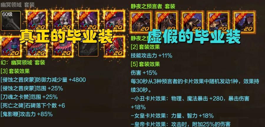然後總結一下:異界套升級後強大,傷害超史詩套,適合平民小號。升級後可大幅提升抗魔值、套裝屬性等,特化技能手感流暢。升級前較弱,需心理準備。