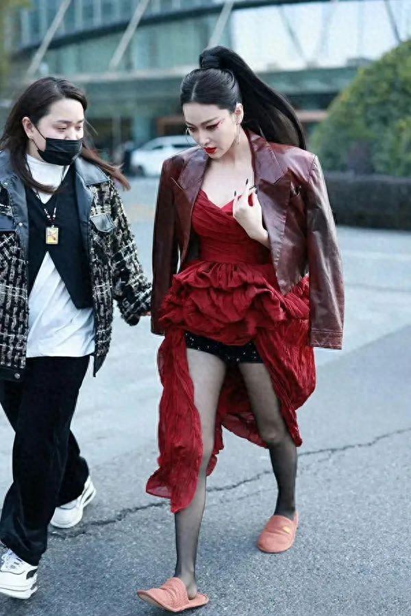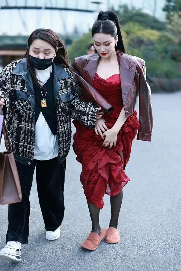 張馨予這套紅裙黑絲配拖鞋的造型顯然是參加活動拍攝中場休息時的選擇,不過這也體現了她本人隨性灑脫的性格。畢竟女明星大多包袱感很重,像張馨予這樣明知道穿着拖鞋搭配長裙會被鏡頭拍,也無所顧忌。這樣放飛自我又有點率真的樣子,還真是反差感十足讓人喜歡。