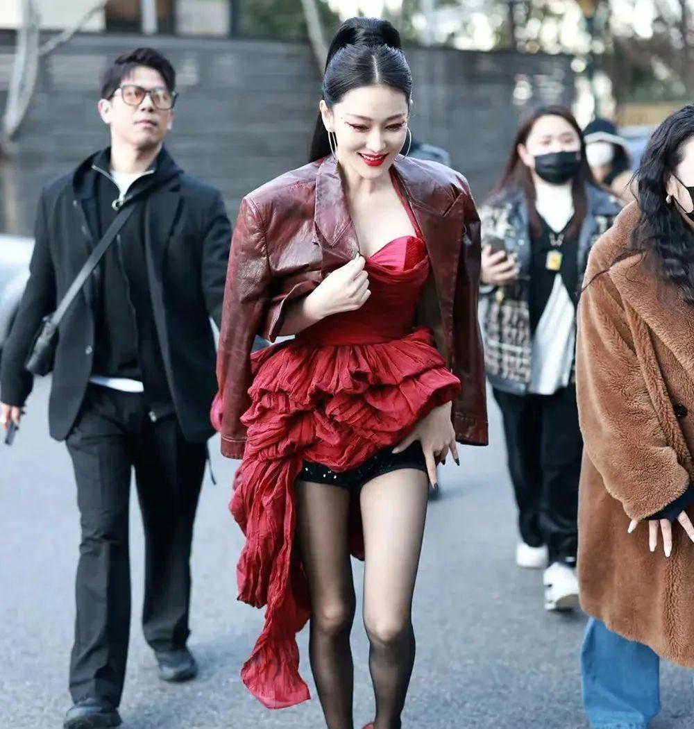 張馨予當天是出席活動,所以在性感嫵媚的紅色長裙外套了一件酒紅色皮衣,竟然意外的時尚又好看。這件短款皮衣版型立挺,肩部支撐度很好,非常貼合她本人熱辣性感又有些張揚的風格。