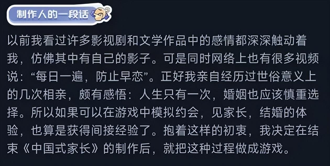 很多《中國式相親》的玩家都玩過《中國式家長》,所以比較偏好現實主義模擬遊戲對於真實人生經歷的挖掘和呈現。