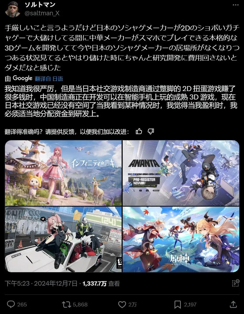 去年底的時候,推特上一羣日本玩家進行了一場熱烈的討論,說的是“當日本的手遊廠商還在做蹩腳的2D遊戲,中國手遊廠商已經開發了一批看起來相當成熟的3D遊戲,無疑正在擠佔前者的生存空間。”