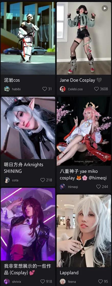 但只要你點進一些玩COS的外國用戶主頁,就能看到他們幾乎一定嘗試過米哈遊和鷹角旗下作品的角色,看上去大多就是因爲這些作品才入了坑,進而再嘗試一些其他“二次元”角色的,比如來自熱門日本動漫的那些。
