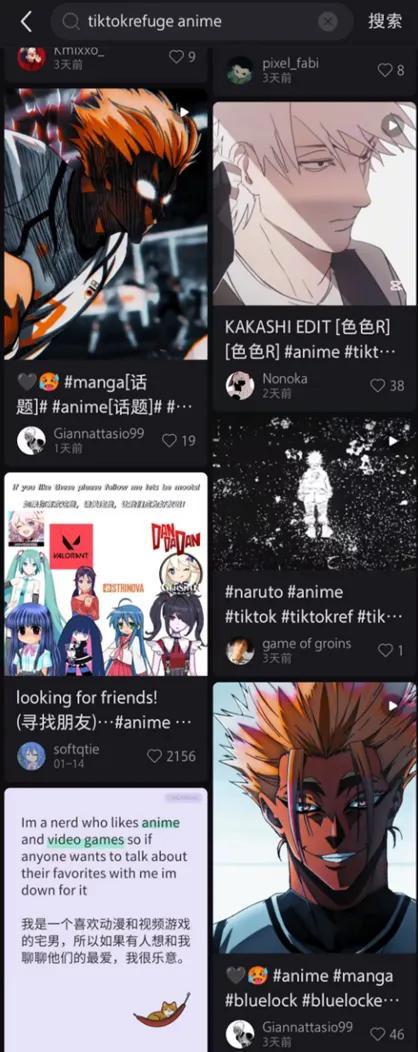 如果你搜索“tiktok難民”+“Anime”,大概率見到的是一些比較傳統的動漫愛好者在分享自己喜歡看什麼番,以及一些動漫剪輯。