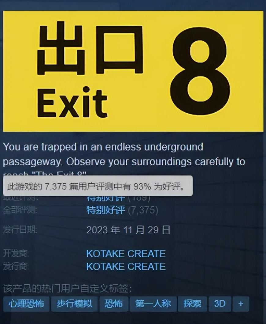 值得一提的是,《8番出口》的作者僅花了3個月便完成了製作,創作初衷也只是作者在開發其他遊戲期間的“實驗”作品,他甚至一度做好了遭到玩家差評的準備。