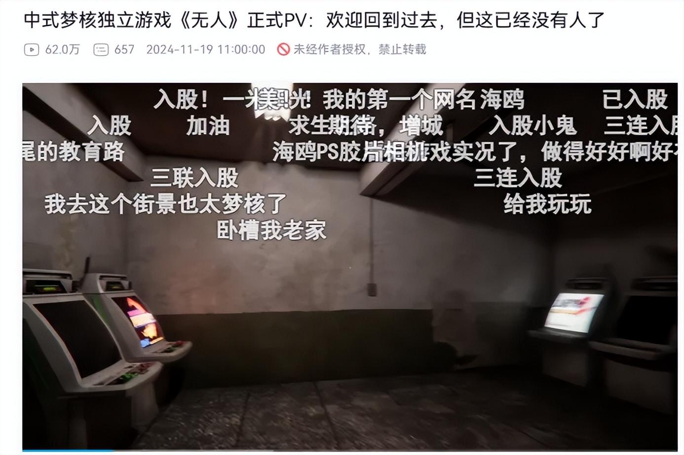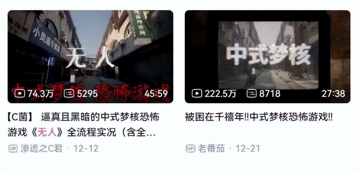 以上畫面均出自去年年底推出的中式恐怖遊戲《無人》,而這款遊戲和它所代表的“懷舊”“夢核”等概念,卻再次成爲了25年開年來視頻和社交媒體平臺上最火爆的話題之一。