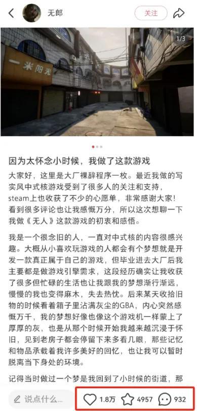 此外,在另一個遊戲氛圍相對沒那麼濃的平臺小紅書裏,無郎那篇《因爲太懷念小時候,我做了這款遊戲》的宣傳貼,甚至在遊戲尚未發佈前,就已經吸引了上萬的點贊和收藏。