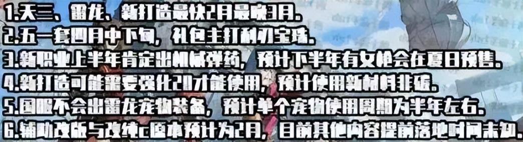 總結一下:某音主播爆料遊戲更新內容:新天空天3、雷龍、新打造系統2-3月上線;五一套4月下旬推出;上半年推機械彈藥,下半年估推女槍;鬼泣、修羅改版3-4月上;封印石、魔力結晶不變;新增家園系統;困難奧茲瑪4-5月上線。