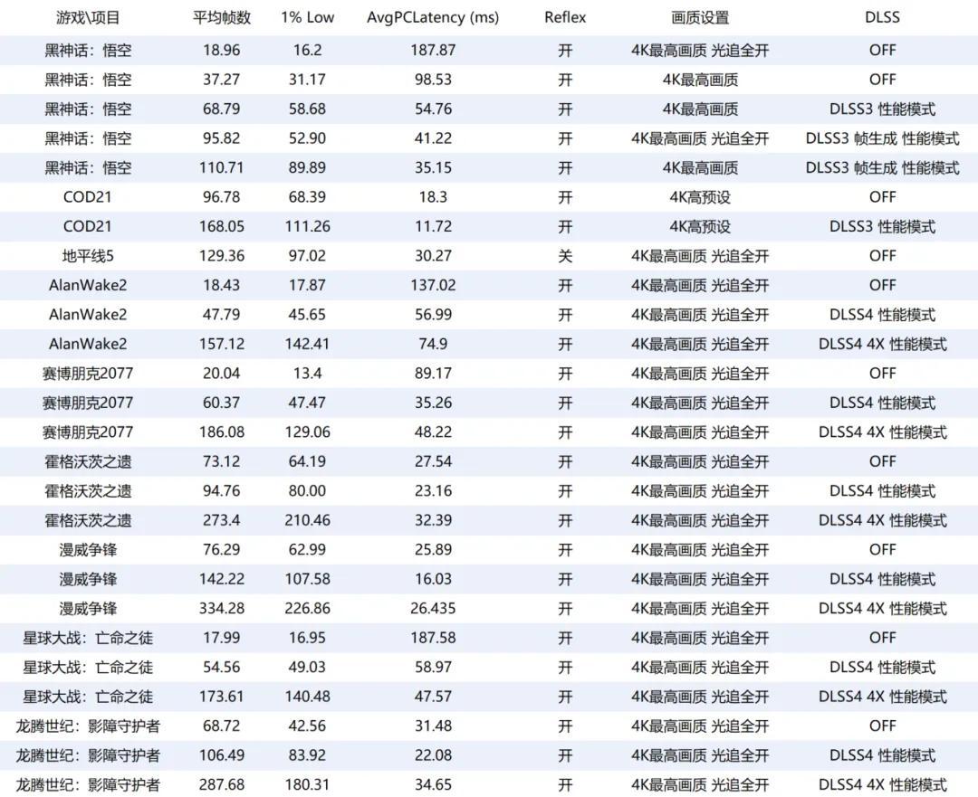 可以看到幾款還未支持DLSS 4的遊戲,幀數提升也與3DMark的測試結果基本相同。