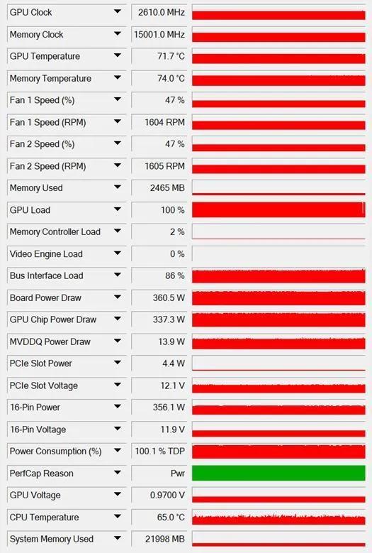 顯卡的TDP爲360W,單烤GPU半小時後,核心溫度72度,顯存74度。公版顯卡的體積相對小巧了不少,但散熱和風噪仍然控制得不錯。