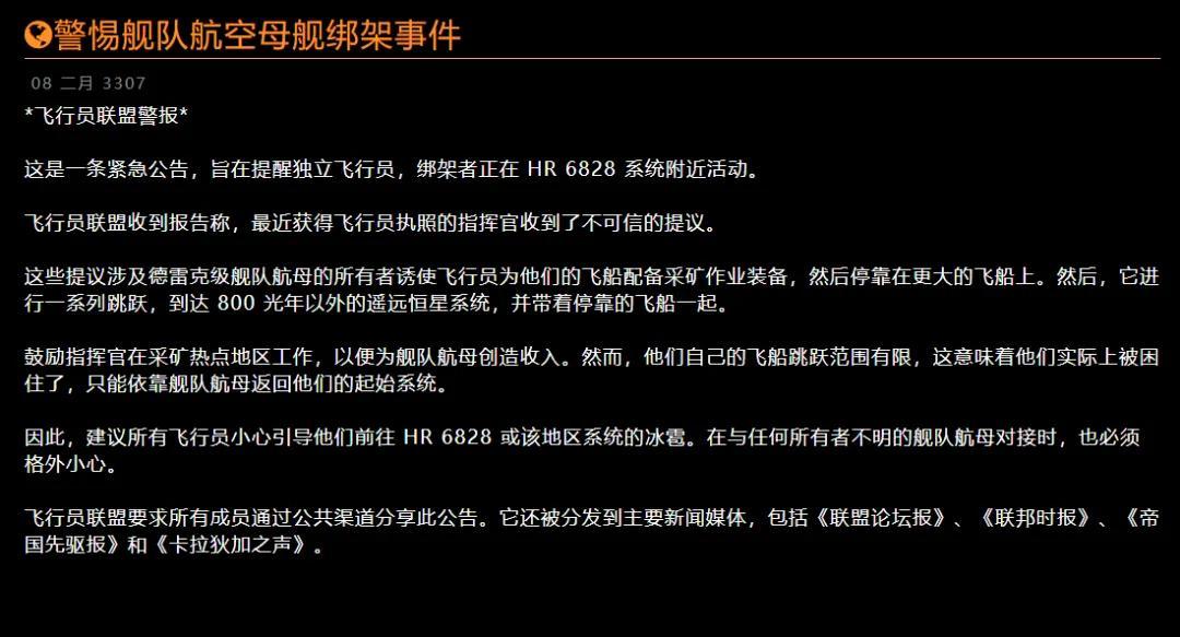 《精英:危險》的官方運營甚至曾發佈公告,警示玩家不要隨便停靠到陌生人的航母上
