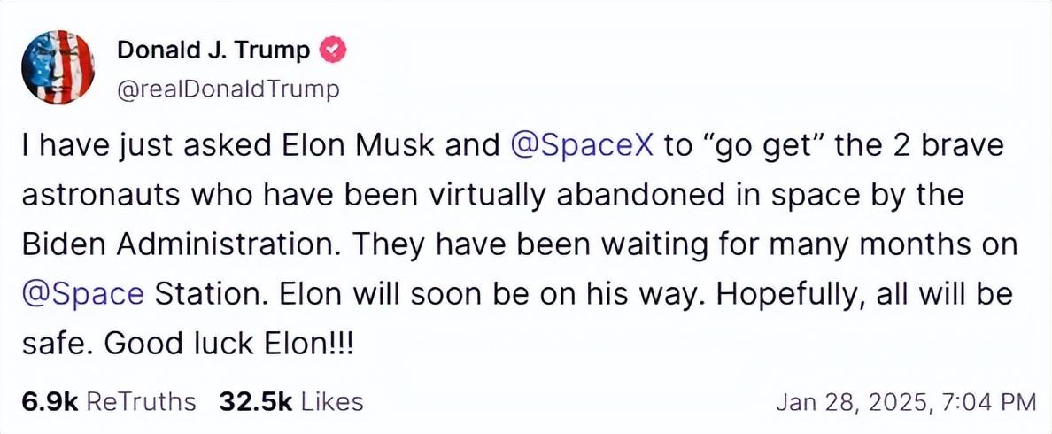 就在幾天前,現任美國總統特朗普通過社交平臺表示:自己已經要求馬斯克和他的SpaceX“去帶回”這兩名宇航員。至於具體什麼時候能成行,目前還是沒個準信。