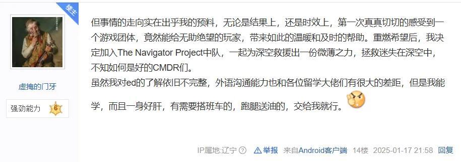 在事情結束後,“門牙”也在貼吧發了個回顧貼。他坦言事件剛發生時,作爲“旅遊”組織者的自己一度心灰意冷,產生了退坑的念頭。但看到國內外玩家熱情而不計成本的救援行動後,讓他又一次重燃起了激情,並選擇加入到深空救援的團隊中,一起跑腿運油。