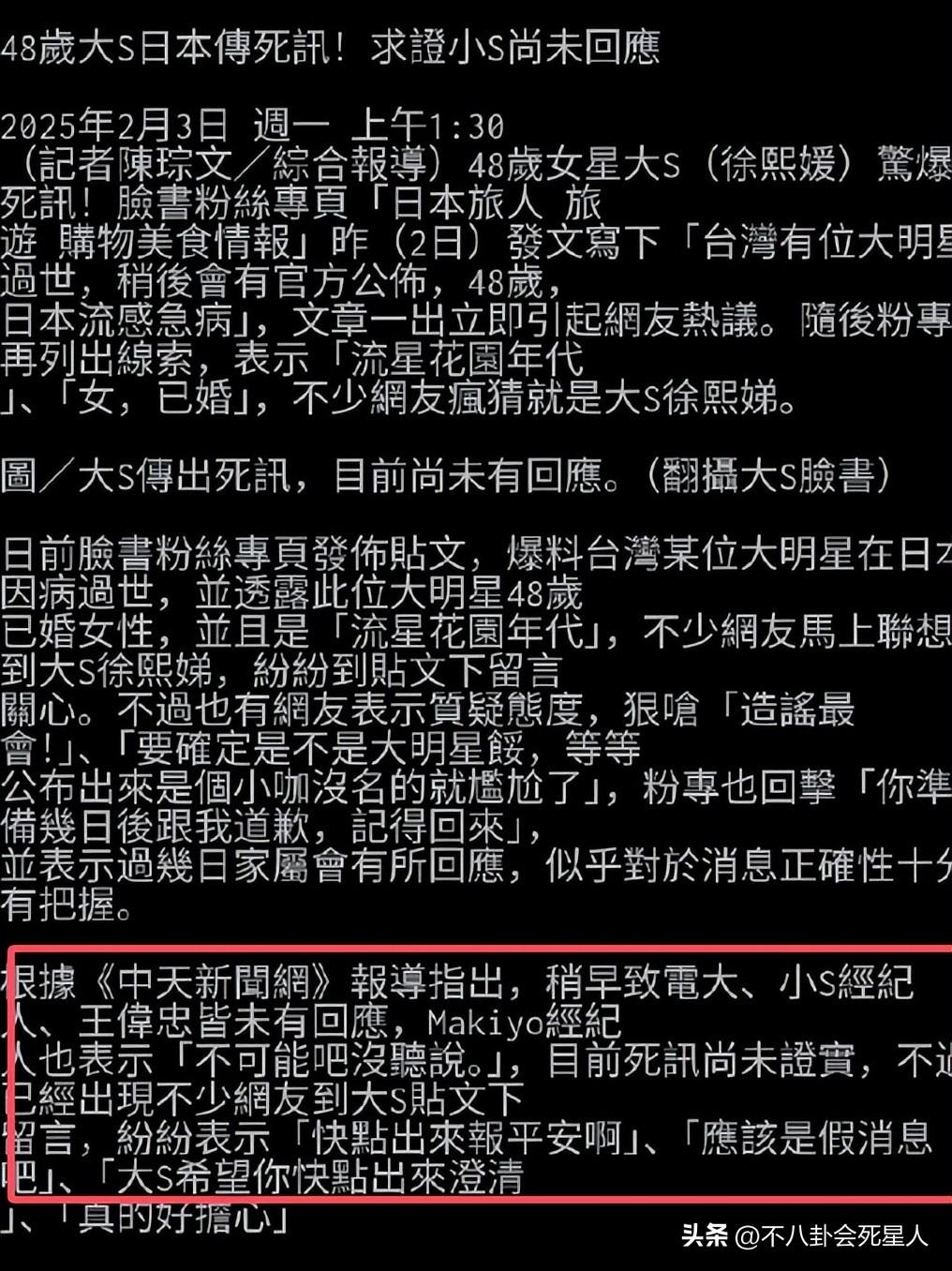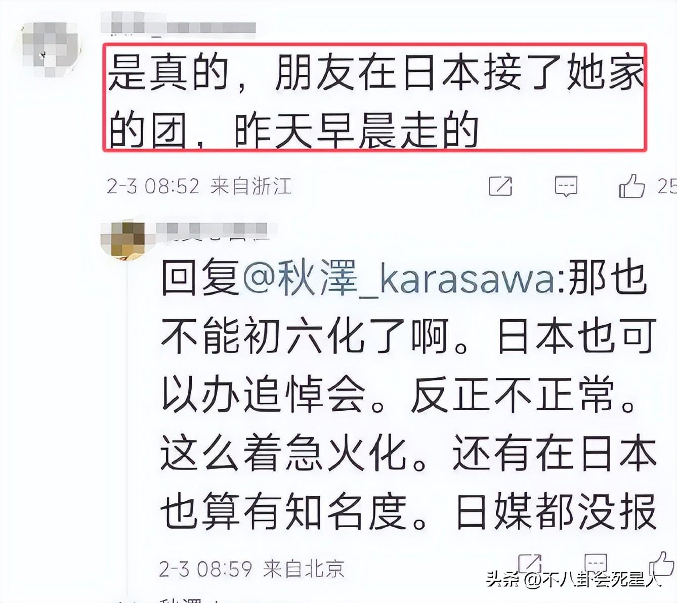 另外,有位網友留言,稱自己的朋友在日本接了大S家的團,出面證實去世的消息是真的,雖然不知道大S會不會在3日火化,可已經離世的消息屬實。