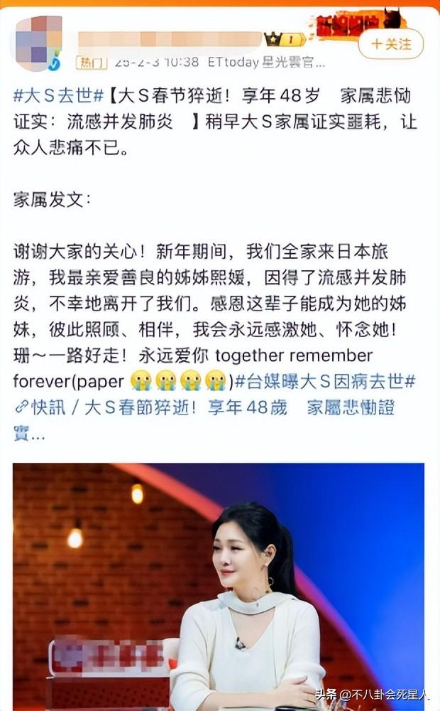 噩耗!48歲大S流感引發肺炎確認離世,家人發文懷念稱感謝陪伴