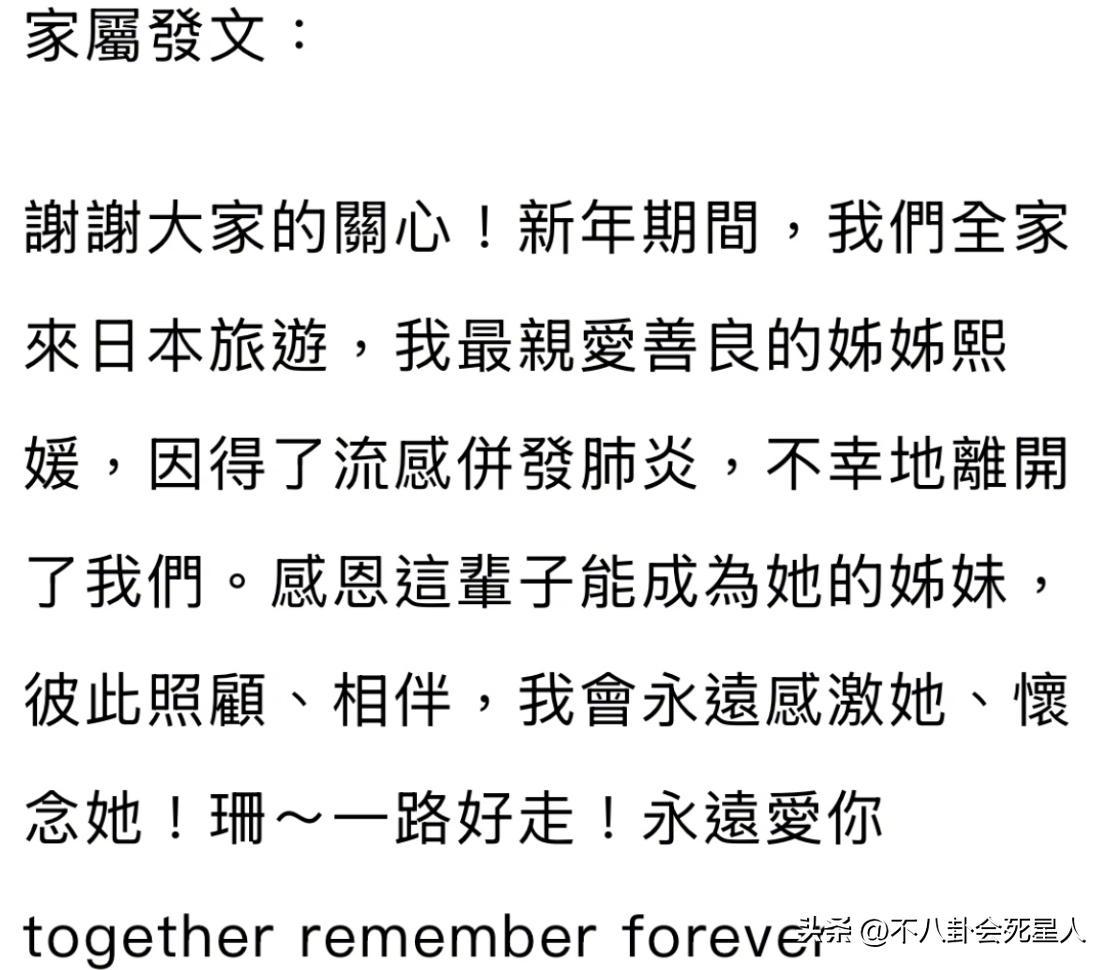 家人稱確實是因爲全家人到日本旅行,大S徐熙媛得了流感並引發肺炎,不幸離世。家人稱感謝這輩子能彼此照顧、相伴,並永遠懷念她。